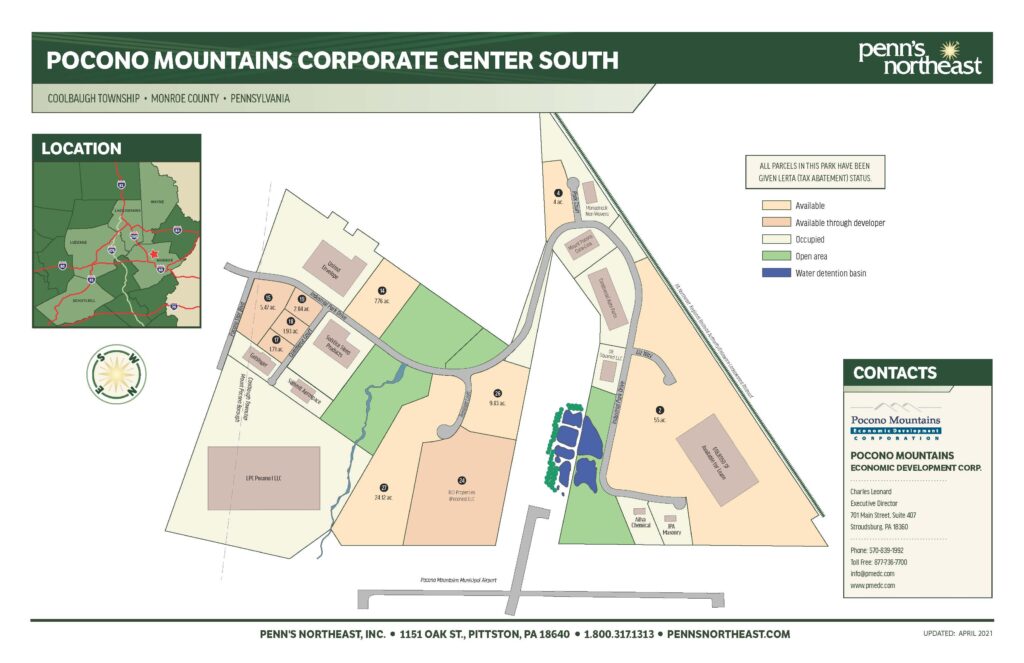 Pocono Mountains Industries purchased 360 acres to develop this park (the Pocono Mountains Business Park) adjacent to the Pocono Mountains Municipal Airport. In order to develop this property, a water and sewer system were constructed with the help of the United States Economic Development Administration (E.D.A.) which is now operated and maintained by Mount Pocono Municipal Authority.