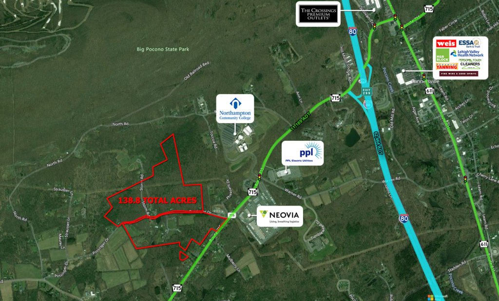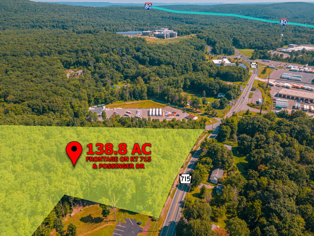 UNDER CONTRACT. This 138.8 acres property has 135 industrial-zoned land for sale in Tannersville. The 138.8 acre property has 135 industrial-zoned acres located a mile from the Tannersville exit of Interstate 80. Site is situated along Possinger Drive with 500 feet of frontage on Route 715. The property is located in Jackson Township and is currently operating as Streamside Camp and Conference Center with over 40,000 square feet of improvements. North parcel is comprised of 82.5 contiguous acres of which 79.5 are zoned industrial. The southern parcel is 55.5 contiguous acres of industrial zoned land.